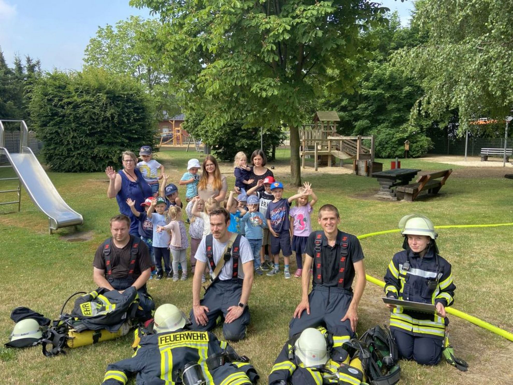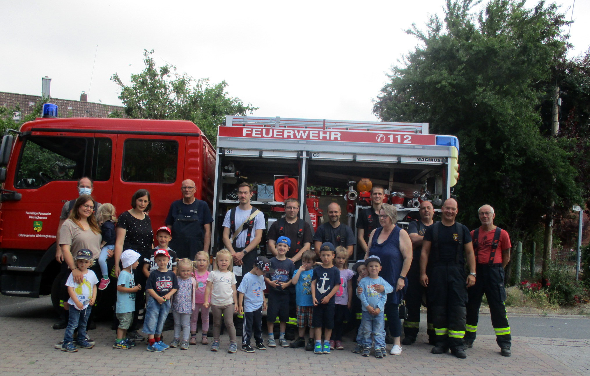 Drei mutige Kinder hatten sich bereit erklärt, in dem mit Theaternebel verrauchten Räumen auf die Feuerwehr zu warten. Bereits in der letzten Woche wurde das Thema den Kindern nähergebracht. Es wurde auch ein Feuerwehrauto gebaut, mit dem die Kinder das Thema spielerisch begreifen konnten. Ein Trupp der Feuerwehr ging unter Atemschutz in die Kita und „rettete“ die Vermissten über eine Leiter nach draußen, auch die Brandbekämpfung wurde sichergestellt. Über das Wasser freute sich der Garten der Kita. Die restlichen Kinder hatten sich vorbildlich auf dem Sammelpunkt getroffen. Anschließen wurde das Gebäude ausgiebig belüftet. Um die Arbeit der Feuerwehr besser zu verstehen, zogen die Einsatzkräfte ihre Atemmasken und dicken Einsatzjacken vor den Kindern aus, um zu zeigen, unter der Ausrüstung stecken normale Männer und Frauen, die helfen wollen. Auch die restliche Ausrüstung der Feuerwehr wurde ausgiebig begutachtet. Die Einsatzkräfte werden noch eine Einsatzbesprechung durchführen, um die Übung aus ihrer Sicht zu beurteilen. Im Einsatz waren die Feuerwehr Wichtringhausen und Hohenbostel mit insgesamt zwei Fahrzeugen und elf Kameraden und Kameradinnen.