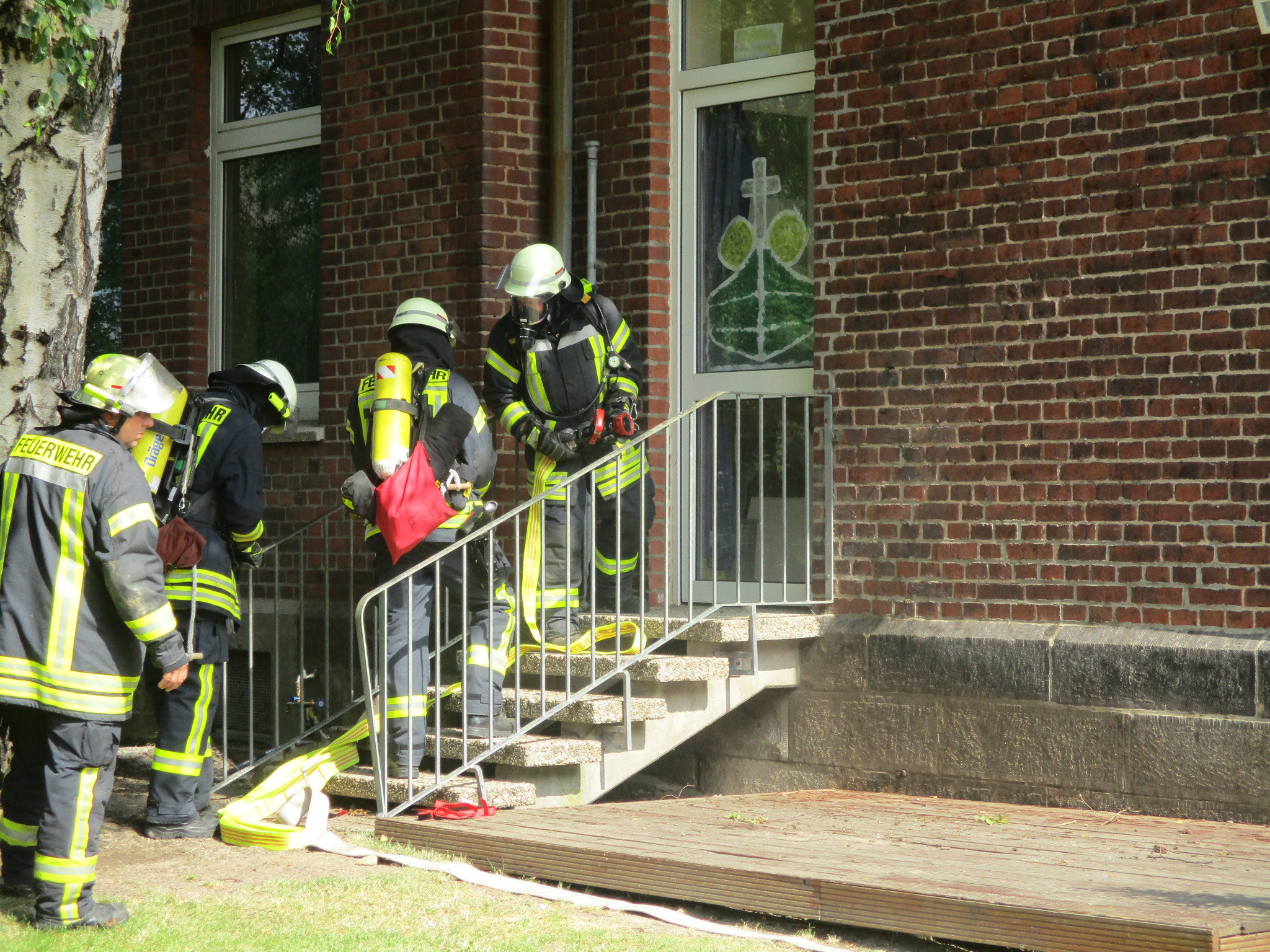 Gegen 10 Uhr wurde die Feuerwehr zur Kita Rasselbande in Wichtringhausen gerufen. Laut Einsatzmeldung gab es eine starke Rauchentwicklung und drei Kinder und eine Erzieherin sollten vermisst werden. Glücklicherweise war dies nur eine Übung zur Brandschutzerziehung, die in der Kita durchgeführt wurde.