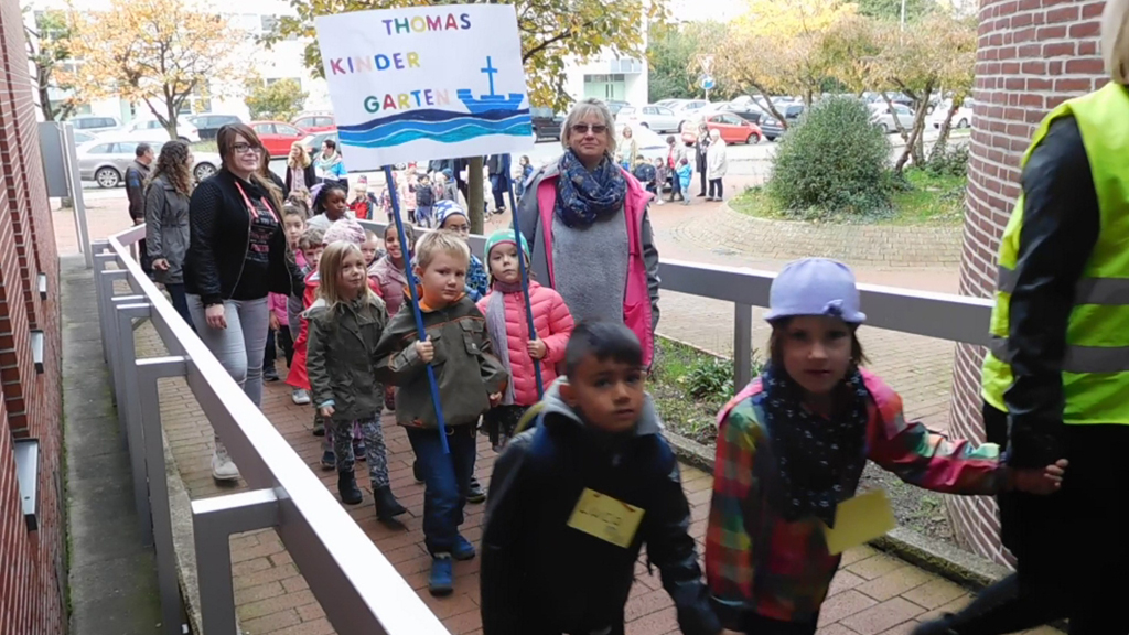 Luther live erleben und Spass dabei haben: Für ca. 120 Kinder der evangelischen Kindergärten in Laatzen war es ein erlebnisreicher Vormittag, als sie am 13. Oktober vom Vorplatz des Leine Center zur Arche (Kirche und Gemeindezentrum der Thomasgemeinde) aufbrachen. Auf dem Weg dorthin wuchs die Spannung, was sie wohl im Gottesdienst zu erwarten hatten. Ein Transparent mit der Aufschrift: „Evangelische Kindergärten unterwegs ……“ wurde vorweg getragen, um die Bedeutung dieser ersten gemeinsamen Veranstaltung hervorzuheben.