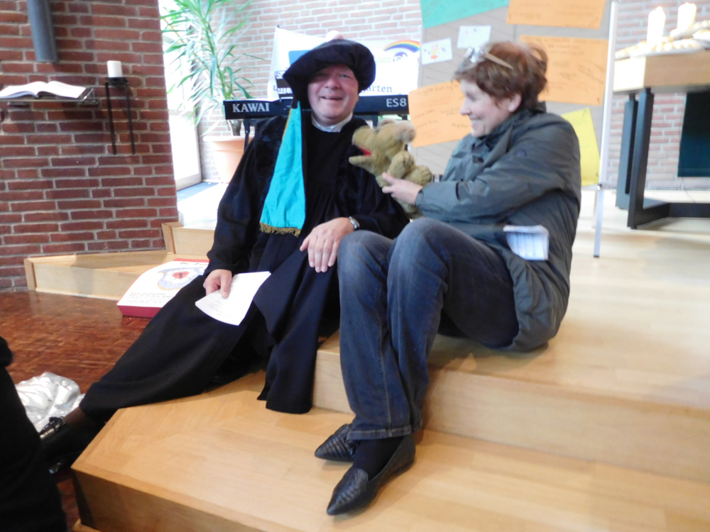 Und dann stand Martin Luther persönlich vor der großen Schar von Kindern. Pastor Burkhard Straeck verkörperte diese Rolle so überzeugend, dass er in seiner mittelalterlichen Kleidung und seinem Habitus dem „echten“ Luther in nichts nachstand. Er wurde von seinem Hund Tölpel (mit der Handpuppe von Sybille Jüppner gespielt) begleitet, der ihn unablässig bezupfte, mit immer neuen Entdeckungen durch den Raum trieb, zu jedem Gegenstand eine Frage hatte und ihm keine Atempause gönnte. Es entstand eine tolle Atmosphäre, die sich auf alle Anwesenden übertrug, da die beiden Akteure vollen Einsatz zeigten und vor Vergnügen sprühten.