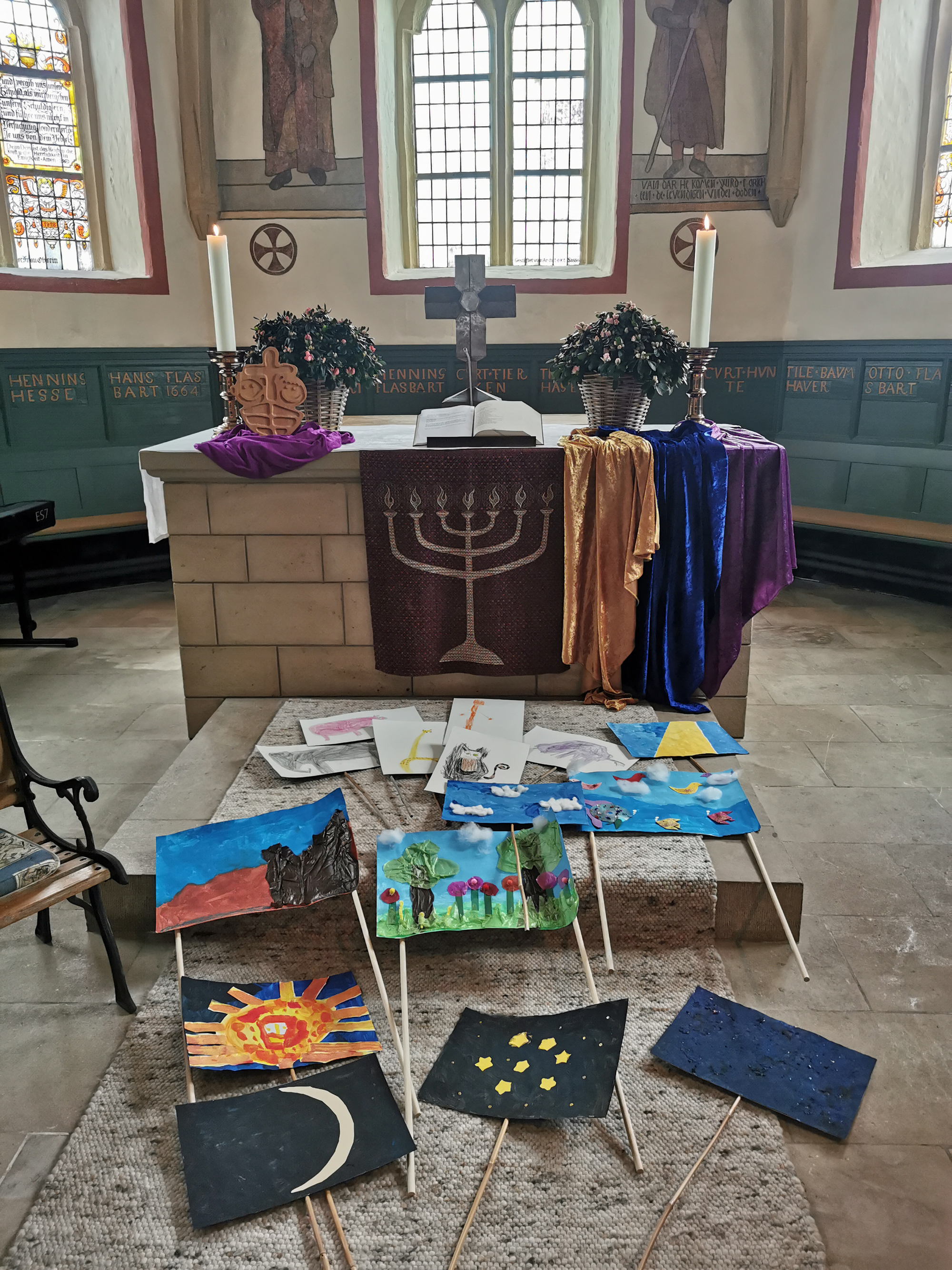 Die Kindergartenkinder bemalten zuvor in ihren Kindergärten Bilder zu den Tagen der Schöpfungsgeschichte und zeigten diese beim Erzählen der Schöpfungsgeschichte den Gästen in der Kirche. Gemeinsamm wurde auch gesungen, wie "Gottes Liebe ist so wunderbar", "Gott hält die Welt in seiner Hand" und "Du hast uns deine Welt geschenkt".