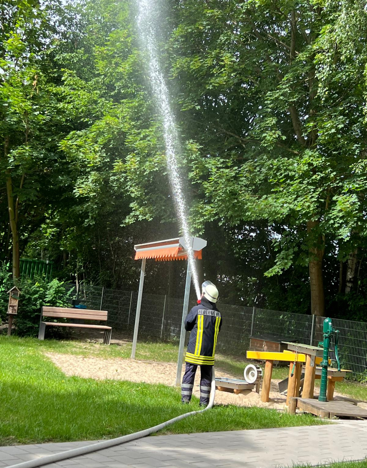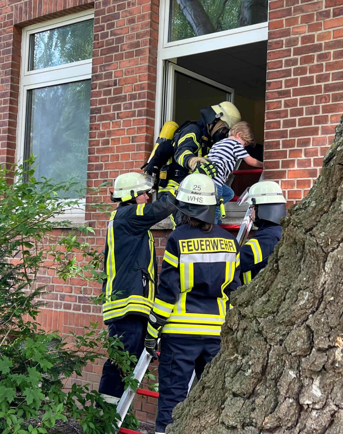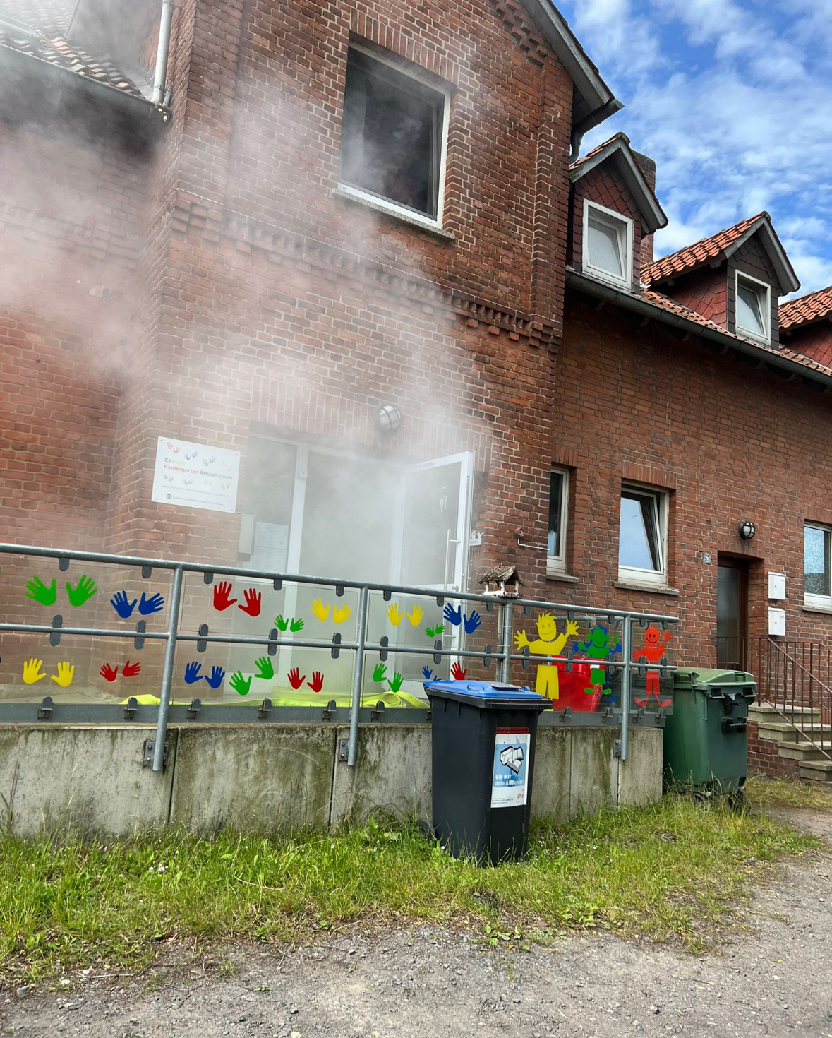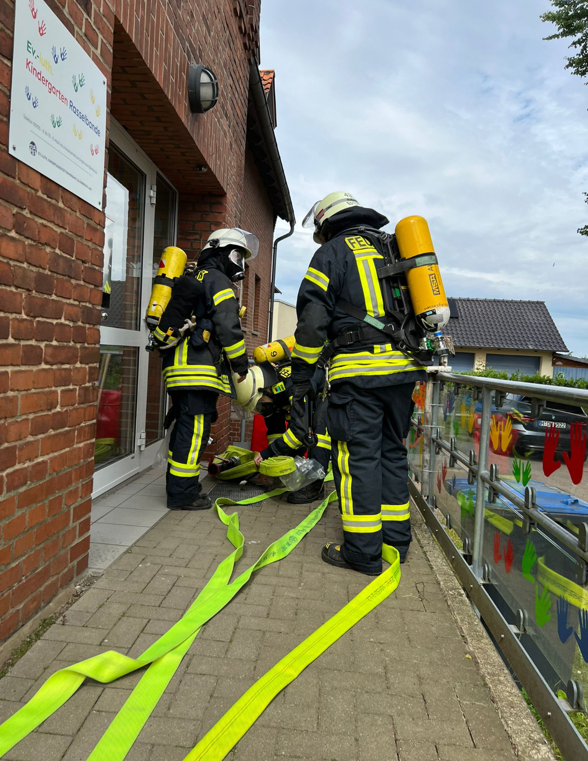Im Kindergarten Wichtringhäuser Rasselbande, wurde beim Eintreffen eine starke Rauchentwicklung festgestellt. Die Leiterin des Kindergartens, meldete mindestens sieben Kinder und eine Kollegin als vermisst. Sofort wurden mehrere Atemschutztrupps zur Menschenrettung eingesetzt. Auf der Rückseite des Gebäudes, konnten alle vermissten Personen sicher durch ein Fenster mit der Stegleiter gerettet werden .