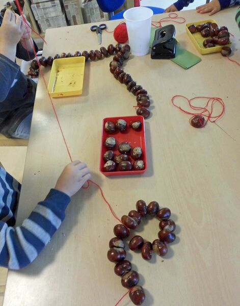 Durch eine Spende von Gerd-Peter Zaake kamen noch viele Kastanien dazu. Daraus haben die Kindergartenkinder lange Ketten gebastelt. Somit hatten alle Kinder in den letzten Wochen viel Spaß. Vielen Dank an Herrn Zaake und das Delphi Bad fürs Kastanien sammeln!