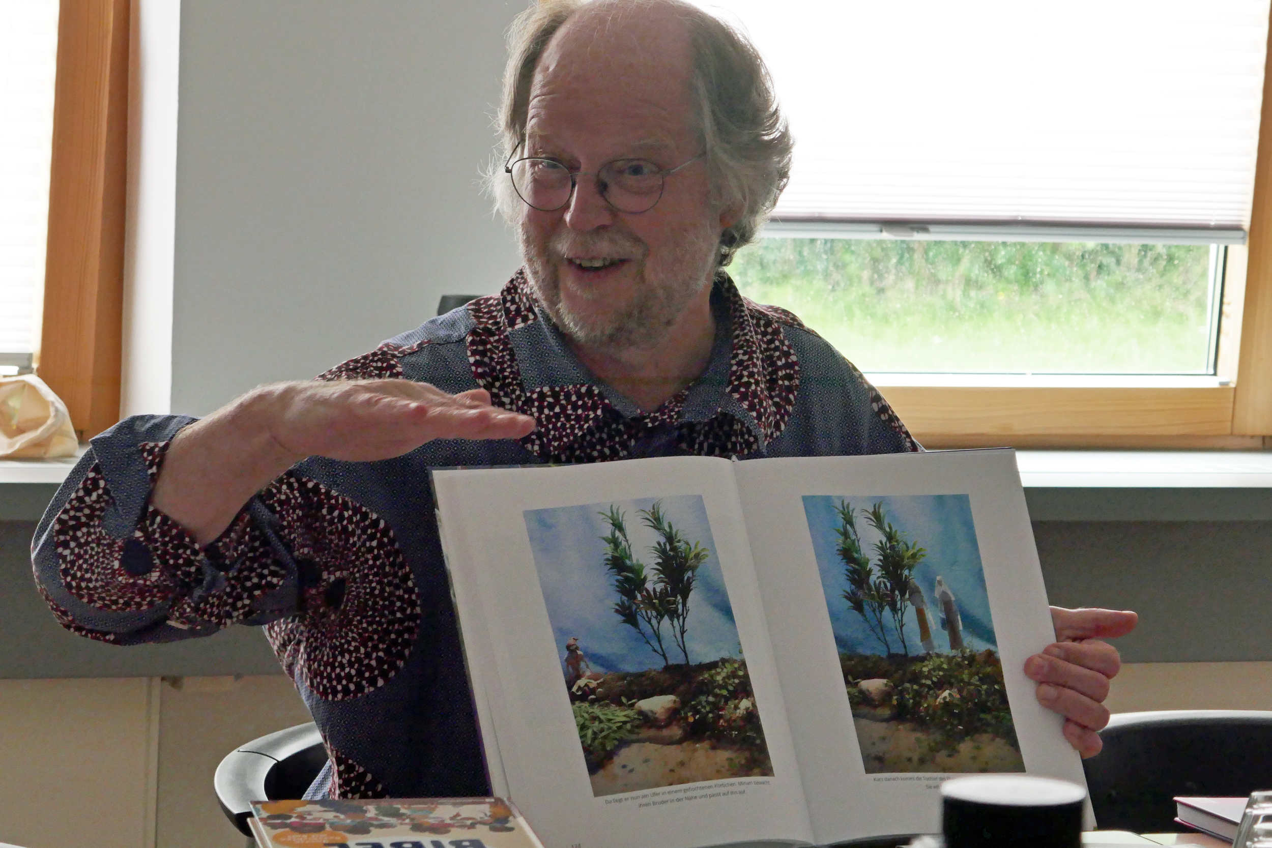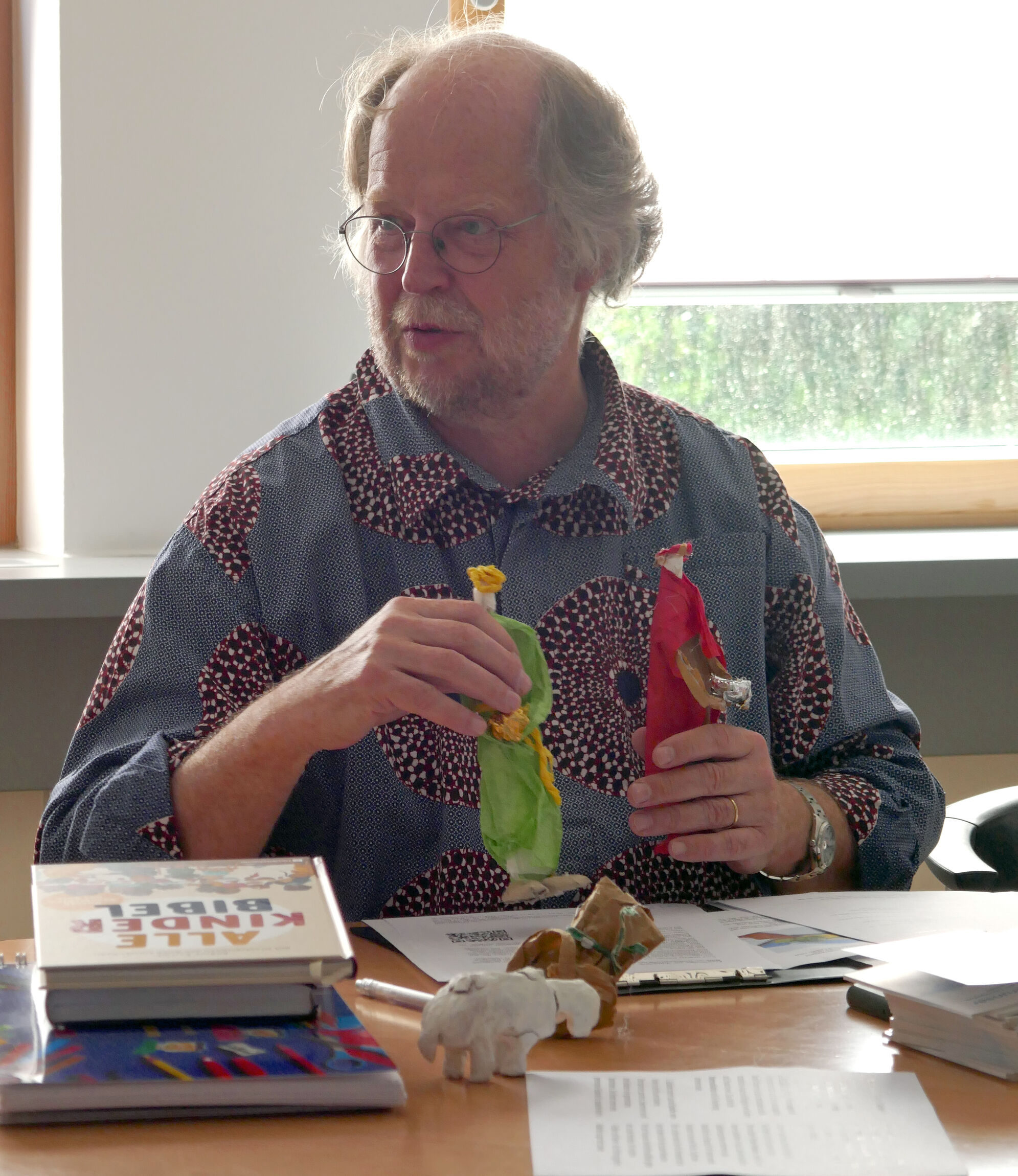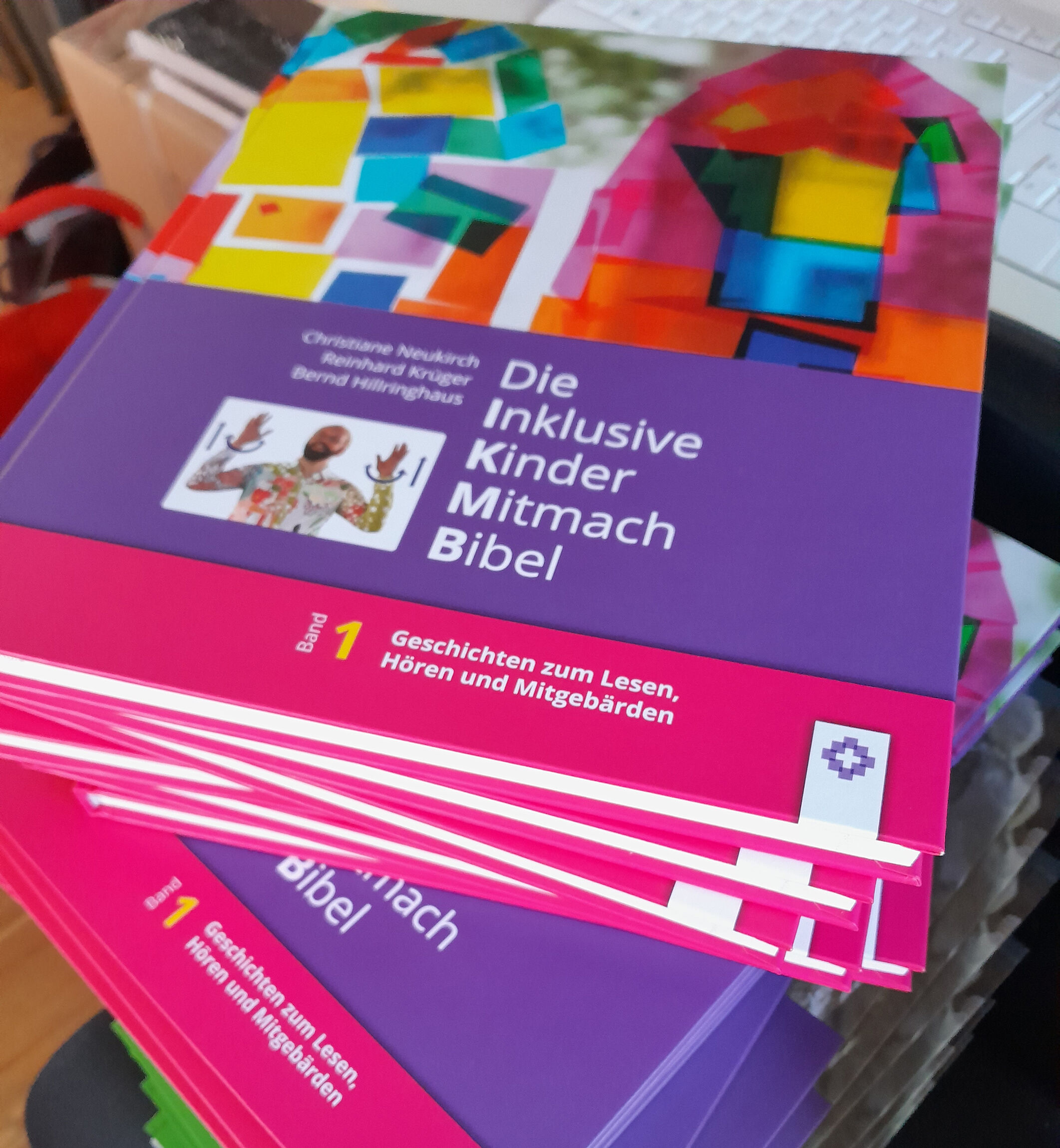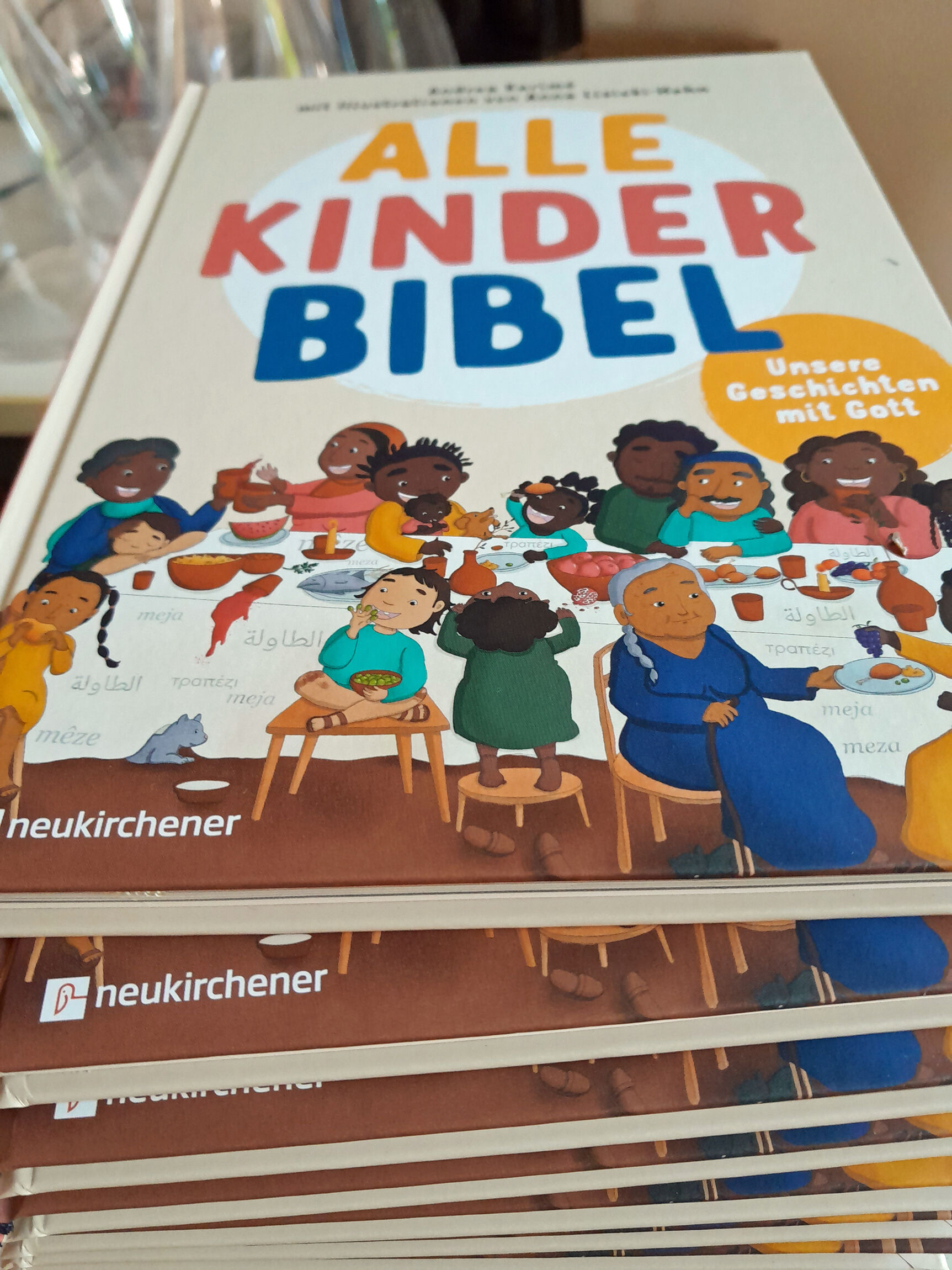 Gleich zwei Bände umfasst die "Inklusive Kinder Mitmach Bibel" (IKMB), die von Christiane Neukirch, Reinhard Krüger und Bernd Hillringhaus für die Landeskirche Hannoves erstellt wurde. Die Autorin arbeitete unter anderen in der Gehörlosenseelsorge. Und so entstanden "Geschichten zum Lesen, Hören und Mitgebärden" die mit vielen Bildern illustriert sind. QR-Codes führen zu Hör- und Sehbeispielen. "Diese inklusive Kinderbibel eignet sich auch für hörende Kinder, denn sie haben Spaß, die Gebärden zu lernen, wie eine universelle Sprache. Die Geschichten der Bibel werden so 'verkörpert'", so der Bibelpastor. Der zweite Band der IKMB besteht aus Szenen zu den biblischen Texten. Dazu hat Bernd Hillringhaus Figuren aus Draht und Papier entwickelt. Steffen Marklein brachte einige Ansichtsexemplare mit, die auf großes Interesse im Leitungskreis stießen. Er stellte noch die "Fühlbibel" für erblindete Menschen vor - in ihr wird die Geschichte von Jona in Braille-Schrift und mit vielen taktilen Elementen erzählt. Und ebenfalls neu erschienen ist die "Alle Kinder Bibel" von Andrea Karimé mit Illustrationen von Anna Lisicki-Hehn. Diese Bibel zeigt einen vielfältigen und gleichermaßen realistischen Blick - "denn die Menschen in der Bibel, auch Jesus, werden nicht hellhäutig gewesen sein". Auf jeder Seite sind Wörter in vielen verschiedenen Sprachen abgedruckt. Und Josef hält in der Erzählung von Weihnachten den neu geborenen Jesus ganz selbstverständlich in seinen Armen, während sich Maria ausruht.