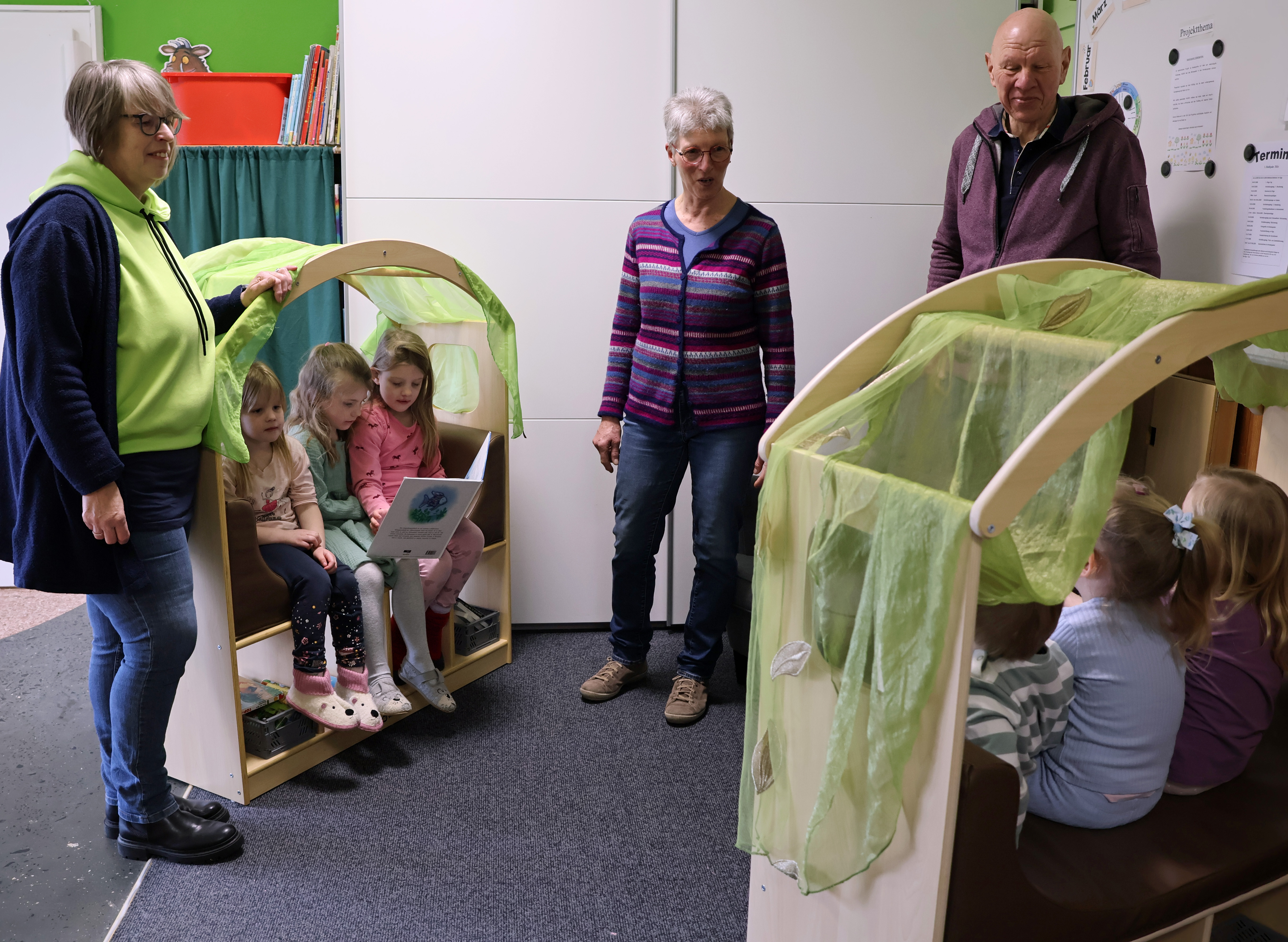 Ein großer Sessel und zwei neue, gemütliche Lesebänke bilden jetzt einen neuen Bereich im großen Flur der "Rasselbande", der Kita in Wichtringhausen. Die Bänke konnte die Kita dank der Stiftung Thomaskinder bestellen. Am Mittwoch, 4. März, waren nun die Kuratoriumsvorsitzende Ulrike Henjes und ihr Stellvertreter, Axel Heyerhorst, zu Gast in der Kita. Schnell wurden die Gäste neben den Kindern auch zu "Bücher-Anschauende" in der Leseecke.