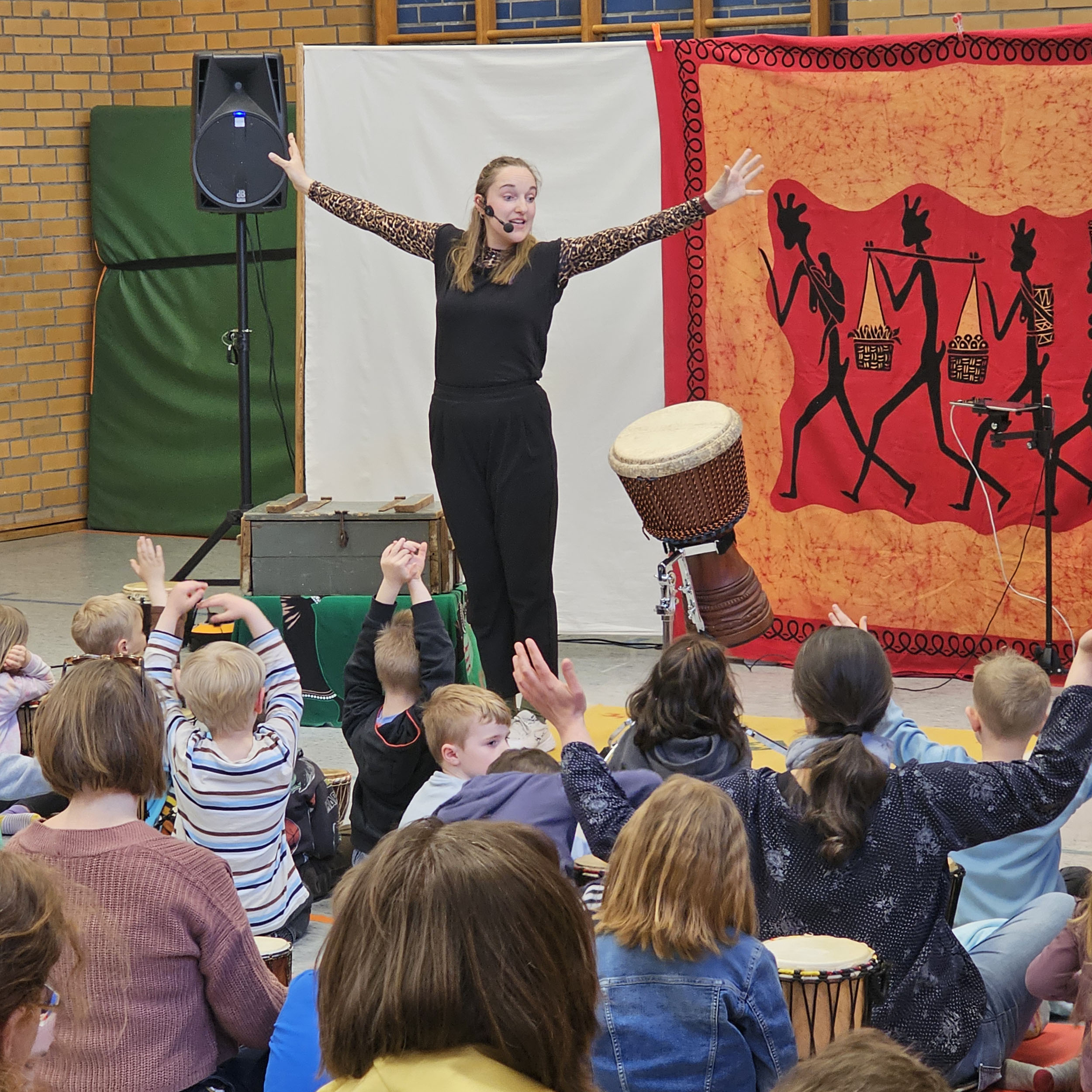 Wie das so ist mit Fernreisen, es bedarf der Vorbereitung. Der Flug sollte nach Afrika gehen. Dort kennt man sich aus mit Trommeln und Reisen. Nach der Begrüßung gab es am Vormittag zwei Reisegruppen, die sich über Sprache, Tiere, Lieder und Landesgewohnheiten von Afrika informieren konnten. Begleitet mit zahlreichen Trommeln und Tanz und Gesang und vielen Geschichten von großen Löwen und kleinen Mäusen, Schlangen, bunten Federn, besonderen Schätzen und vielen Erlebnissen. Awia bo nippa – die Sonne scheint für uns alle!