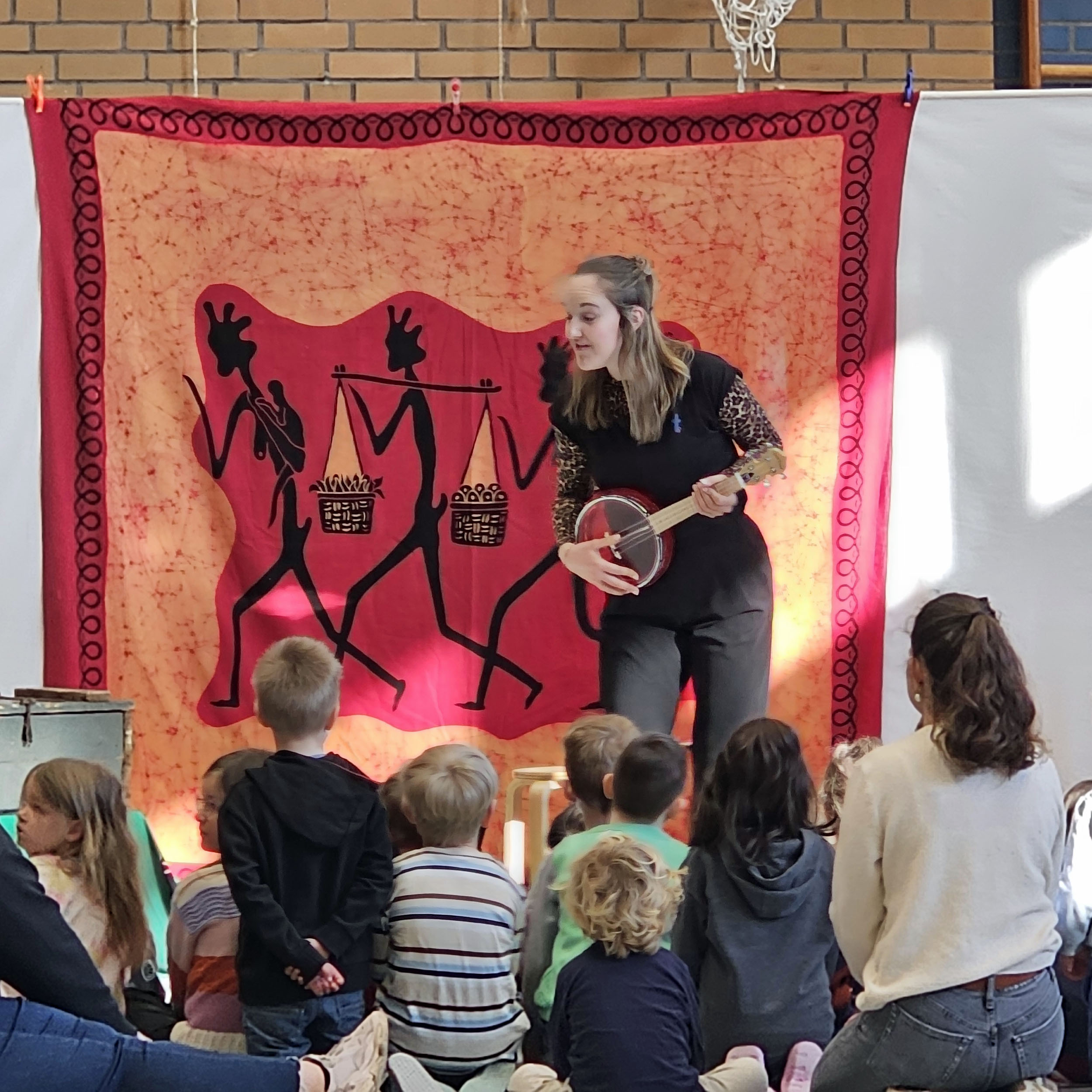 Im Airport der Turnhalle wurden alle Kindergartenkinder von der Trommelerzählerin und Musikerin Mandy Bonse von Theomobil begrüßt und zur Reise eingeladen.