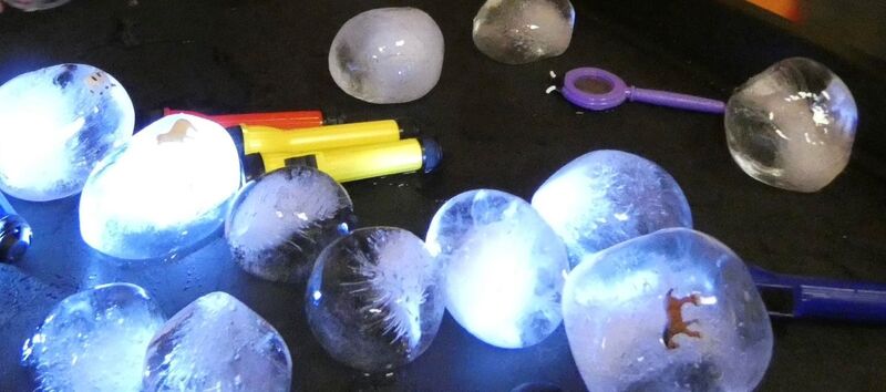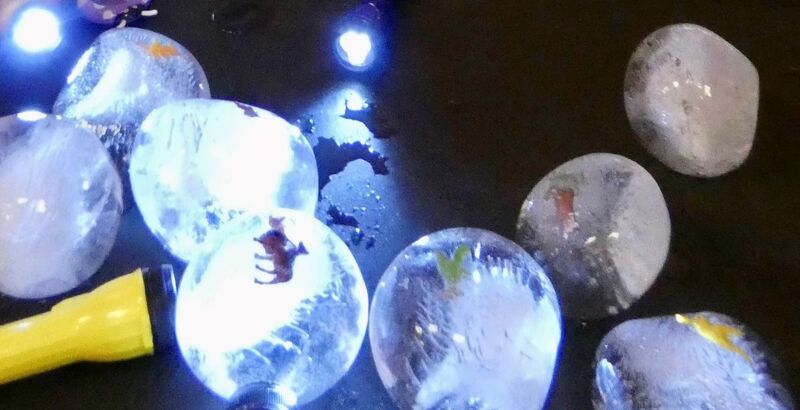 Mit leuchtenden Augen wurden von den Kindern in der Forscherwerkstatt aus kleinen Eisblöcken “Goldmünzen“ durch das Zerschlagen mit einem Hammer herausgeholt. Die Münzen durften, zum Stolz der Kinder, mit nach Hause genommen werden. Auf einem weiteren Forschertablett konnten die Kinder mit Taschenlampen durch gefrorene Eiskugeln leuchten, in denen im Licht kleine Tiere, wie z. B. Hasen, Dinos, Käfer etc. zum Vorschein kamen. Die Kinder erzählten mit ihren Eltern und den pädagogischen Fachkräften über ihre Entdeckungen und waren ganz fasziniert.