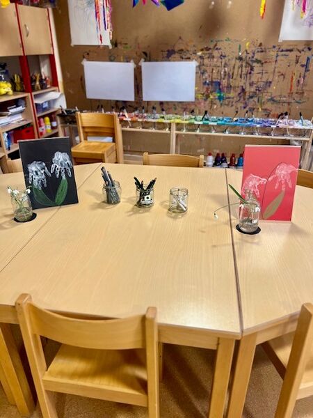 Gleich nebenan gab es in der Bauwerkstatt die Möglichkeit, hohe Türme mit verbundenen Augen zu bauen, welches die Geschicklichkeit der Kinder und Eltern herausforderte. Es hat uns gefreut zu beobachten, wie engagiert und welch tolle Teams die Eltern und ihre Kinder waren. In der Künstlerwerkstatt wurden fleißig Schneeglöckchen mit Farbe auf Papier getupft. Die Kunstwerke konnten mit nach Hause genommen werden.