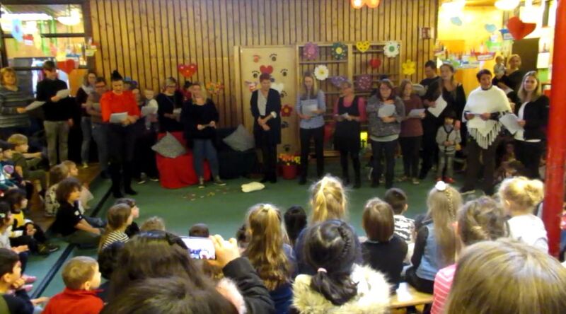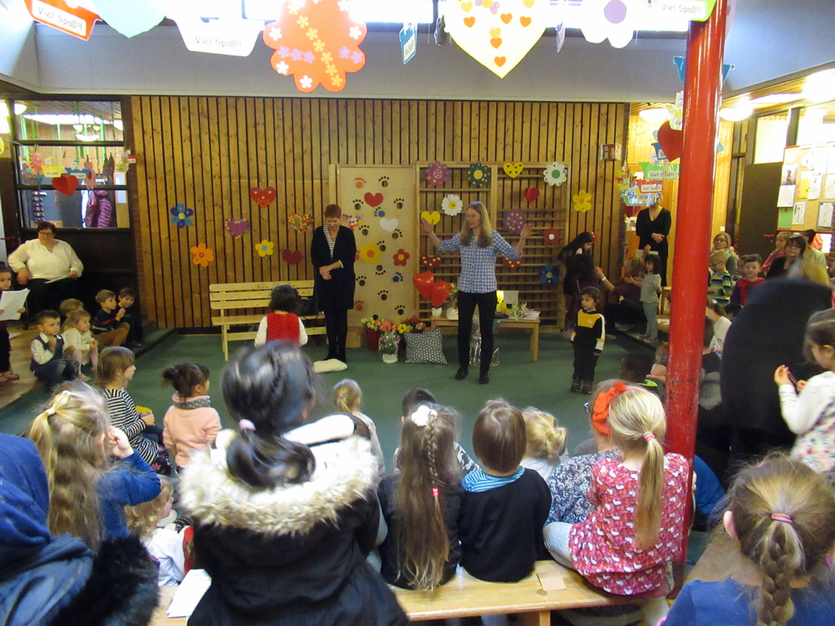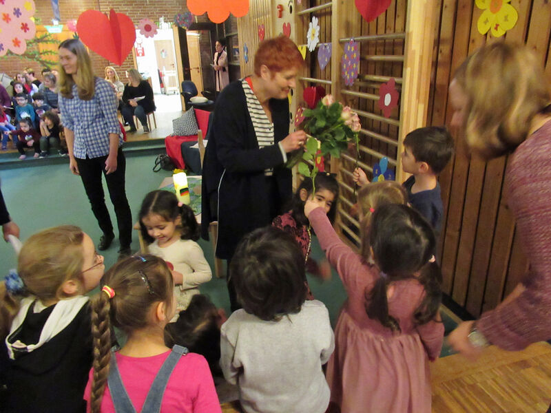 Nach der Begrüßung durch die stellvertretende Leiterin des Thomaskindergartens, Kirsten Merk, war der erste Höhepunkt dieser Feierstunde der Auftritt der Kinder, der von ihnen bereits voller Spannung erwartet worden war. In einer liebevollen Geste überreichten die Kinder aus den einzelnen Gruppen nacheinander eine Rose an „ihre Sybille“ und alle Kinder freuten sich, wenn sie die Rose lächelnd und dankend von ihnen entgegennahm. Ein wahres Blumenmeer mit über 100 Rosen konnte sie schließlich neben sich platzieren.