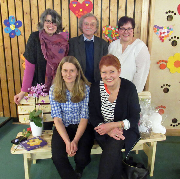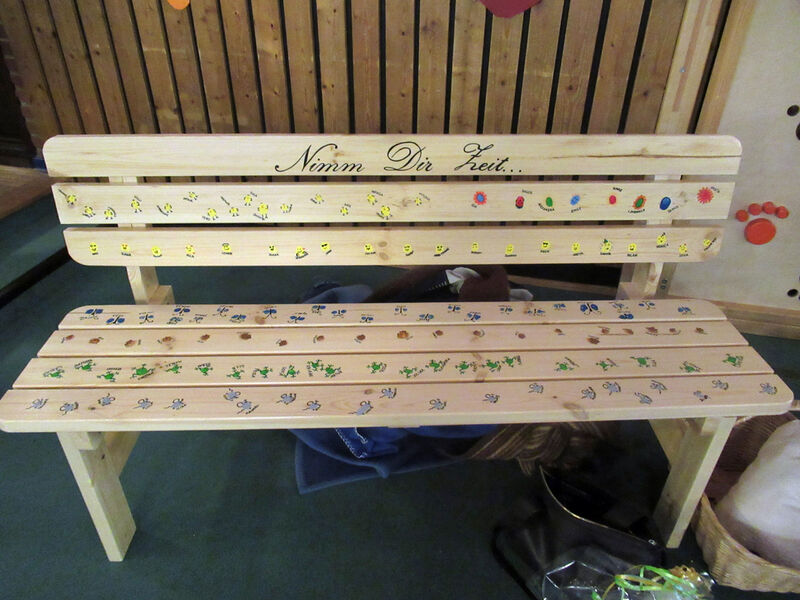 Kirsten Merk übergab anschließend das Wort an die Elternvertreterin Frau Schildt, die neben „guten Wünschen“ Blumen und ein Geschenk im Namen der Eltern überreichte. Viele von ihnen hatten es sich nicht nehmen lassen, zur heutigen Verabschiedung zu kommen. Schließlich kam die Stunde der Mitarbeitenden, die viele Jahre, teilweise sogar Jahrzehnte mit Sybille Jüppner als Team zusammengearbeitet haben. Sie nahmen ihre Leiterin in die Mitte und ehrten sie mit einem umgedichteten Kinderlied mit dem Anfangstext: „Wir sagen heut `Auf Wiedersehn` und lassen Dich nur ungern gehn“. Neben diesem musikalischen Auftaktgeschenk folgte dann als große Überraschung die Übergabe einer von Kirsten Merk gebauten und von ihr sowie den Mitarbeitenden und den Kindern bunt gestalteten Gartenbank. „Nimm Dir Zeit …“ steht zwar als Motto auf der Bank, im gleichen Atemzug wurde aber darauf hingewiesen, dass es damit nicht übertrieben werden sollte. Deshalb wurde im Namen der Mitarbeitenden zusätzlich noch ein Gutschein mit überreicht. Weitere liebevoll gestaltete Geschenke folgten, inklusiv einer Foto-Torte mit Fotos von Sybille Jüppner von vor 45 Jahren und heute.