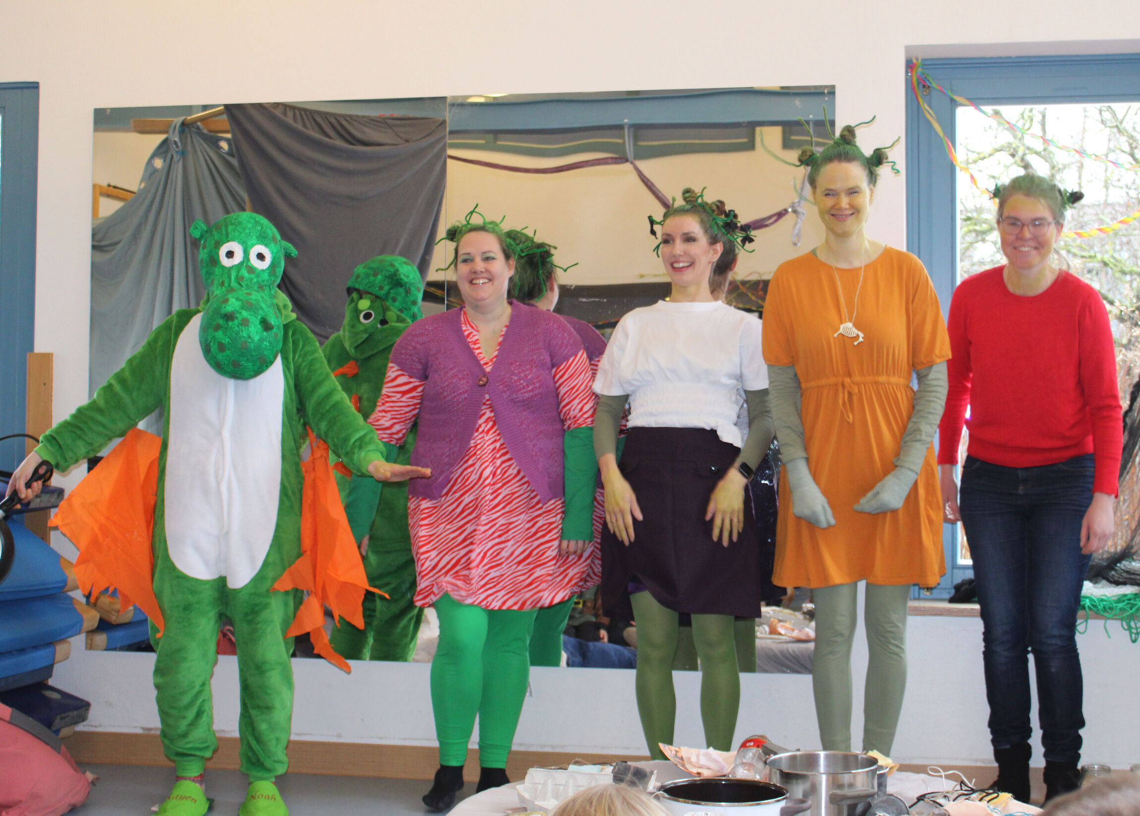 Besonders begeistert hat uns die gelungene Vorführung unserer engagierten Eltern zum Thema Olchis. Mit viel Kreativität, Witz und Herzblut wurde eine Geschichte lebendig und sorgte bei Groß und Klein für beste Unterhaltung. Das aufwendig gestaltete Bühnenbild und die fantasievollen Verkleidungen schaffte eine stimmungsvolle Atmosphäre. Hoffentlich erinnern sich alle möglichst lang an die Botschaft: wenn alle im Haushalt mithelfen, dann geht alles schneller und es bleibt Zeit für gemeinsame Aktionen. So auch bei diesem Fest. Dank Ihrer Mithilfe, zum Beispiel durch die Gaben für das Büfett, entstand eine gelungene Veranstaltung und es blieb Zeit für Gespräche und ein fröhliches Miteinander.