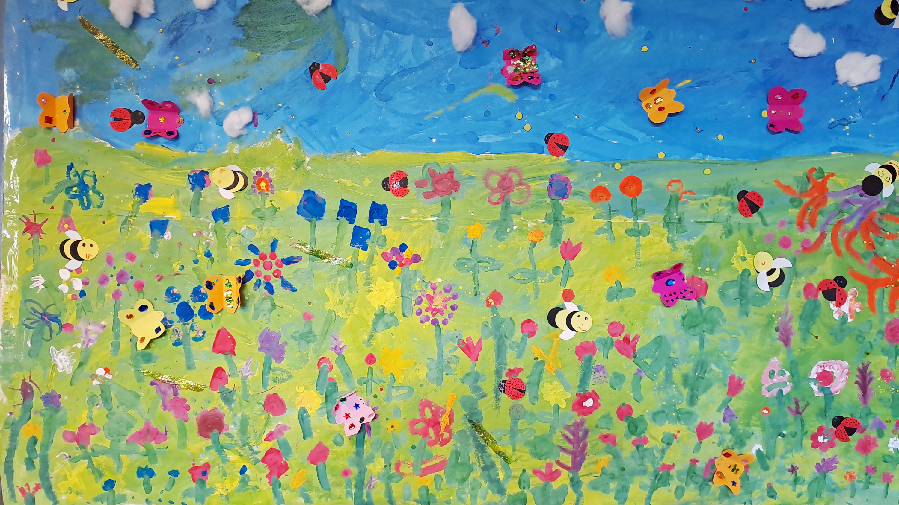 In einer Projektwoche haben die Kinder mit viel Freude, Farbe und Fantasie dieses bunte Frühlingsbild gestaltet. Über mehrere Tage hinweg entstanden mit Pinseln, Fingern, Stempeln und Aufklebern eine blühende Wiese, fröhliche Schmetterlinge, summende Bienen und viele kleine Käfer. Jedes Kind hat eigene Ideen eingebracht, auf seine Weise mitgemacht und so ist ein großes Gemeinschaftskunstwerk entstanden, in dem man immer wieder neue Details entdecken kann.