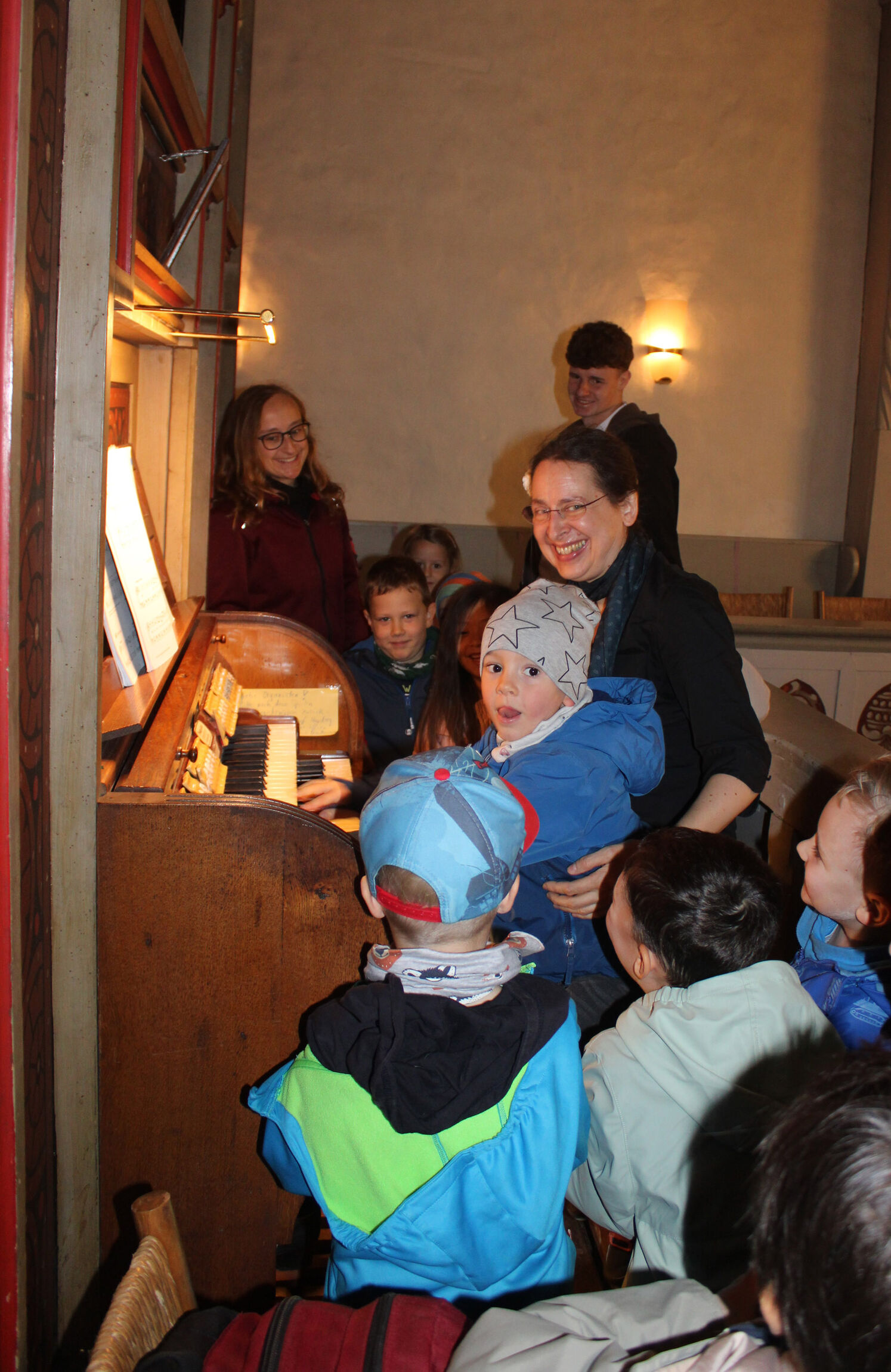 Dann ging es hoch hinauf auf die die Orgelempore. Dort erklärte Barbara von Witzleben den Antrieb der Orgel durch einen Blasebalg, zeigte ihre Orgelschuhe, die sie natürlich nur dort benutzt und spielte kurze Melodien vor. Die Kinder durften raten, um welches Lied es sich wohl handelte. Als Höhepunkt durften die Kinder einzeln auf der Orgelbank Platz nehmen und selbst die Tasten drücken.