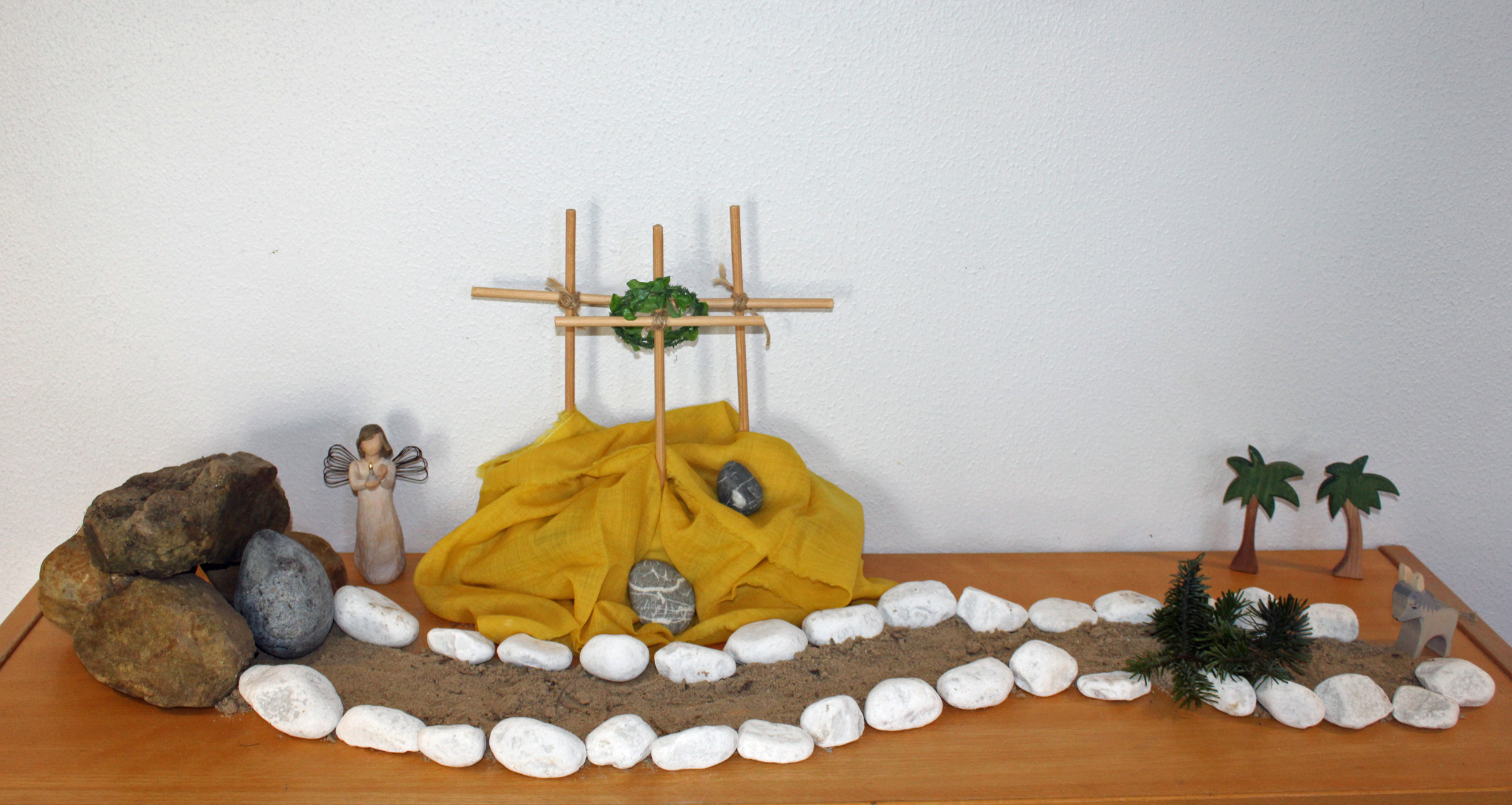 In der Woche vor Ostern haben wir in dem Emmaus-Kindergarten jeden Morgen einen kleinen Gottesdienst gefeiert. Dabei wurde die Ostergeschichte Stück für Stück erzählt. Los ging es damit, dass ein Krug uns eine Geschichte erzählt hat.