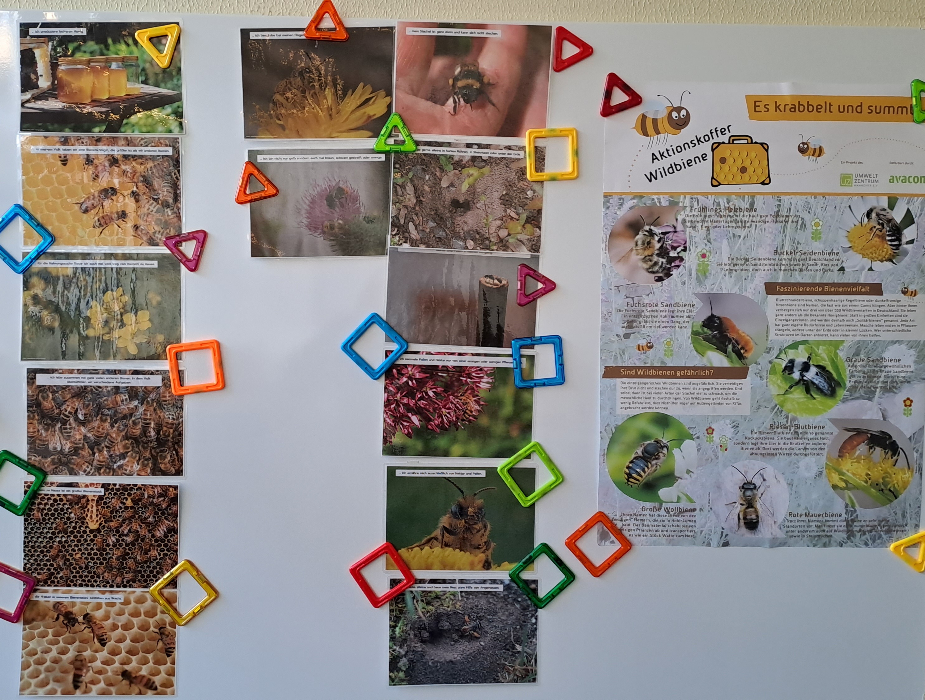 Derzeit findet in unserem Kindergarten ein Bienen-Projekt statt. Dazu wurde uns ein Aktionskoffer des Umweltzentrum Hannover, gefördert durch die Avacon Stiftung, zur Verfügung gestellt. Der Aktionskoffer ist mit vielfältigen Anschauungs- und Bastelmaterialen zum Thema Wildbiene bestückt. In unserem Forscherraum haben einzelne Kinder zwei Wochen lang die Möglichkeit, sich mit dem Thema zu beschäftigen.