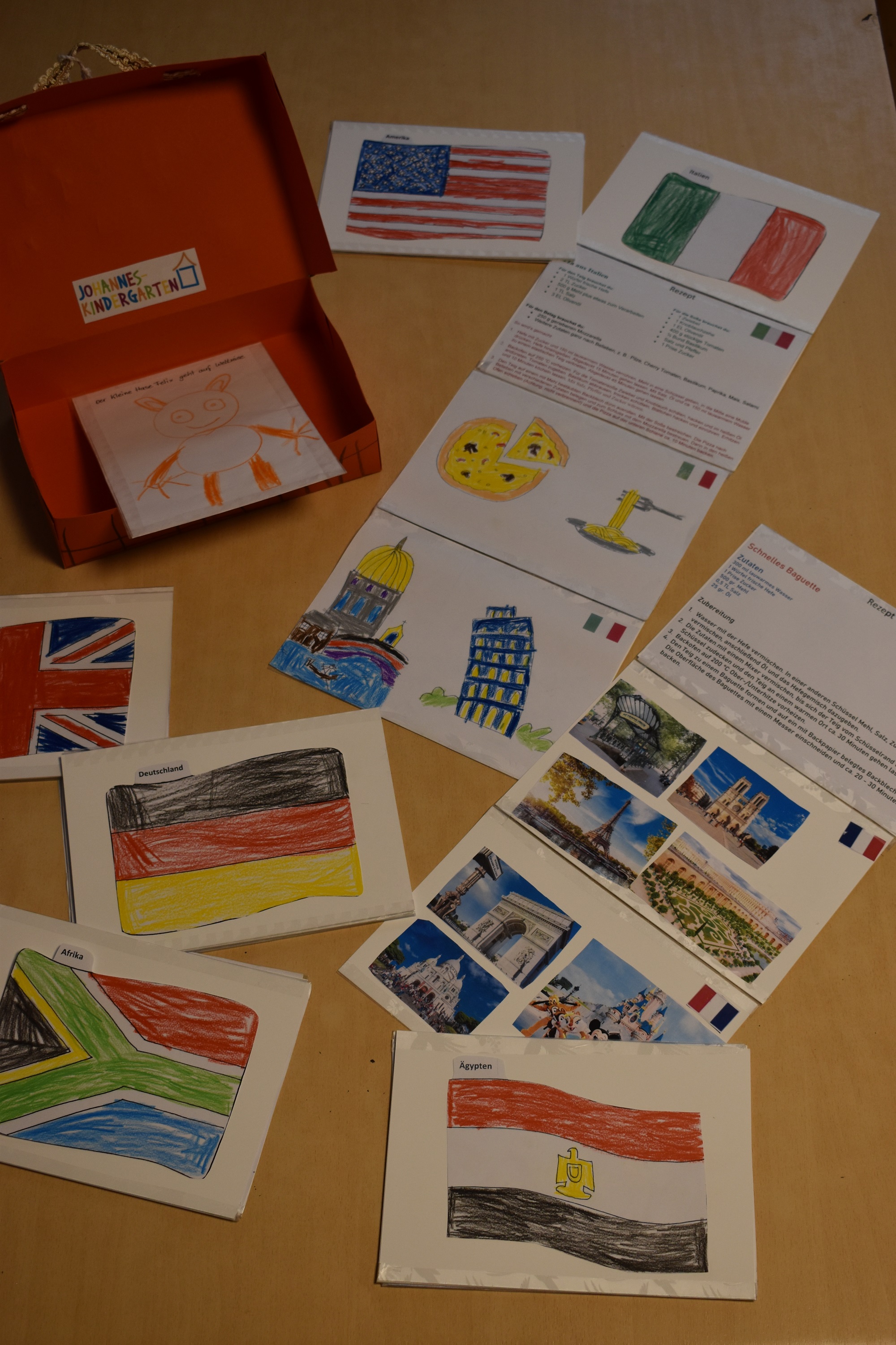 Jedes Kind bastelte einen eigenen Reisekoffer, der mit Bildern, Collagen, Rezepten und Flaggen gefüllt wurde. Zu jedem Land, das wir mit Felix besucht haben, gab es eine landestypische Spezialität. Die wir natürlich gemeinsam zubereiteten und probierten.