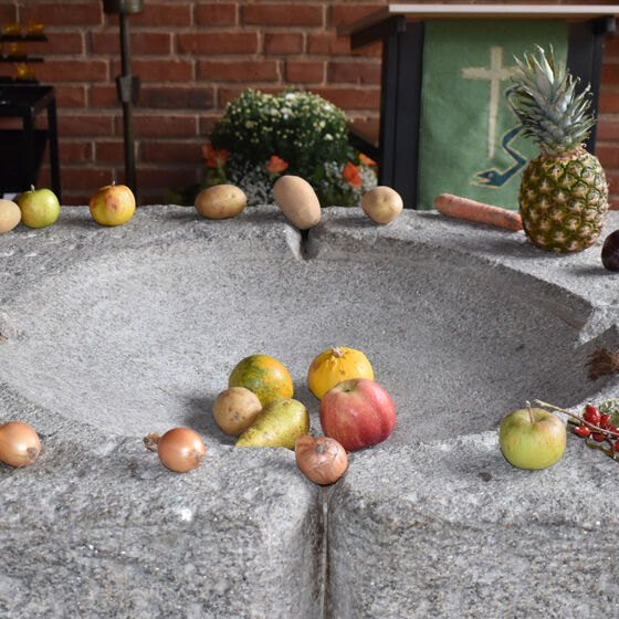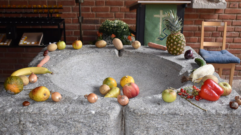 Mit den mitgebrachten Lebensmitteln schmückten die Kinder liebevoll den Taufstein und freuten sich besonders über den Besuch der kleinen Kirchenmaus, die fleißig Samen beisteuerte.